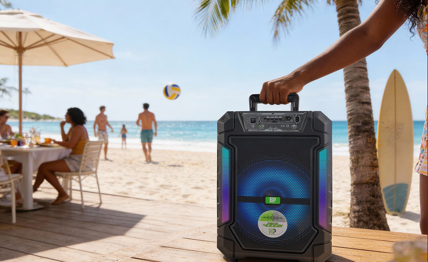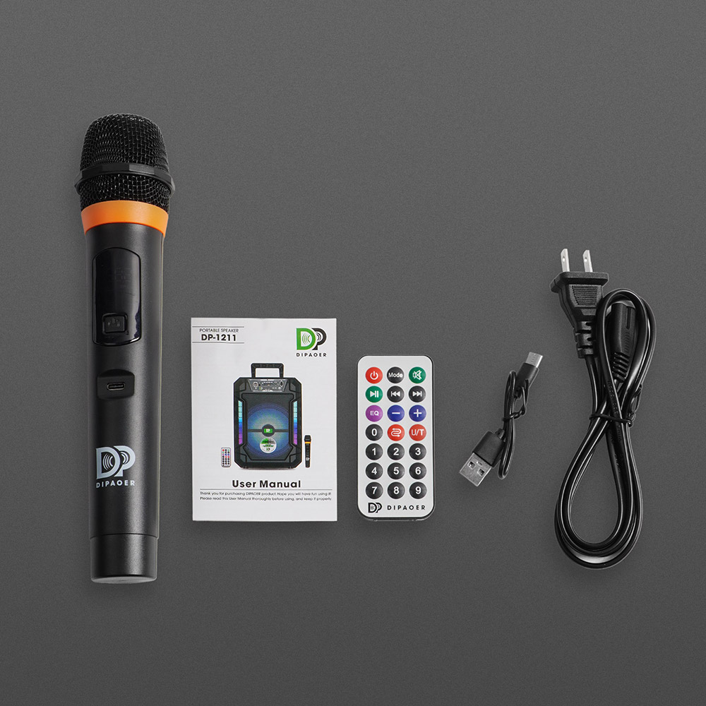配备多功能红外遥控器,可远程控制播放、切换曲目、灯光模式等。