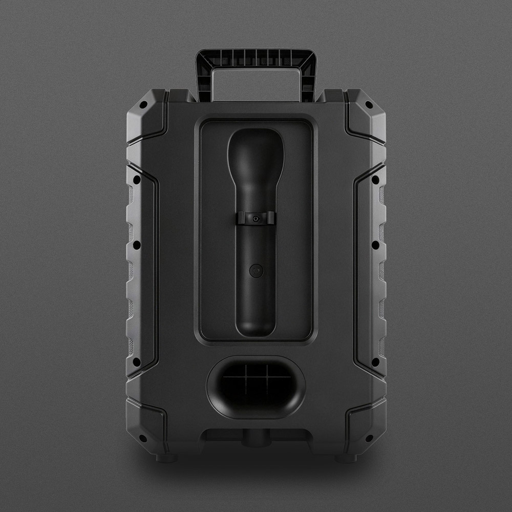 附赠一支无线麦克风,内置可充电电池。机身自带专属收纳位。