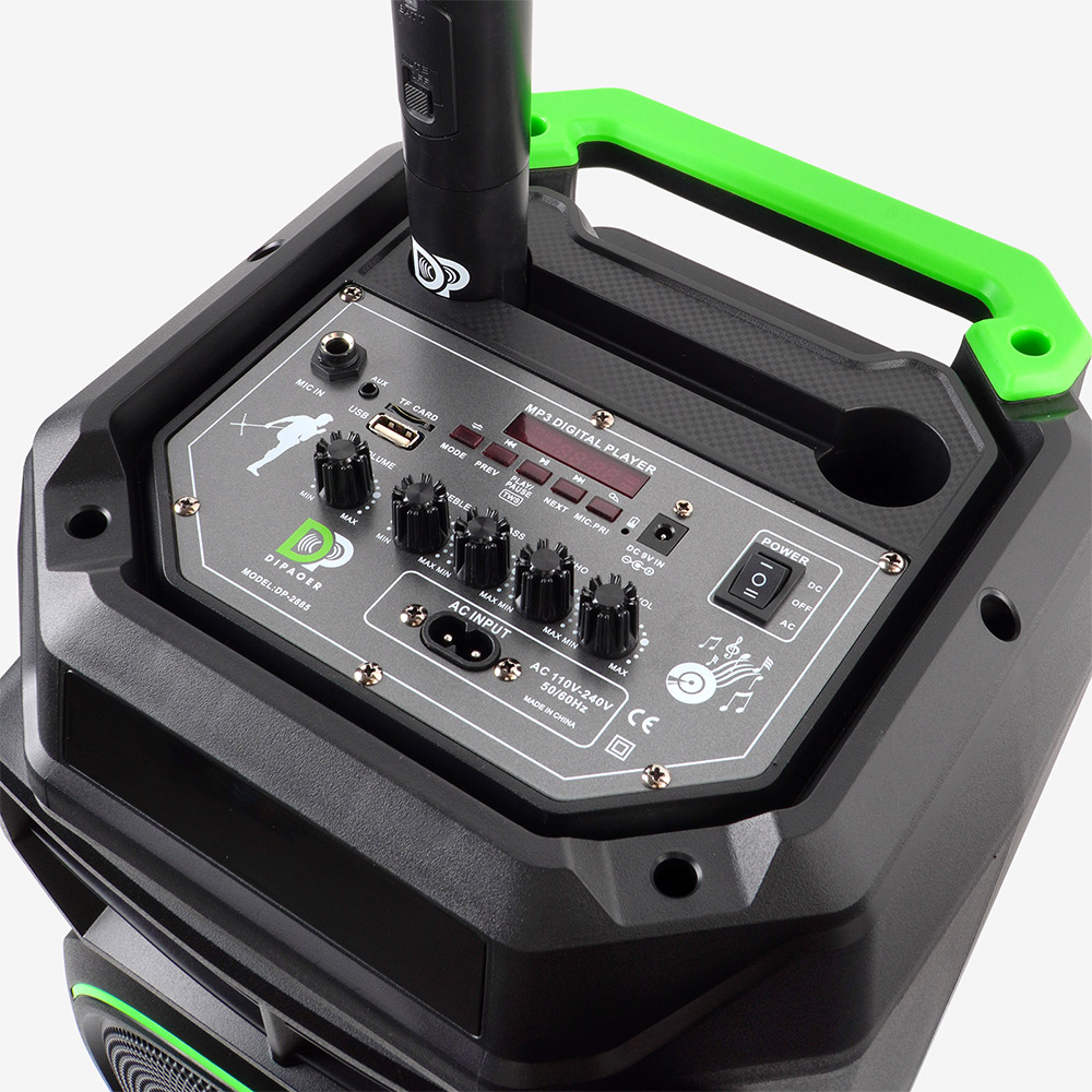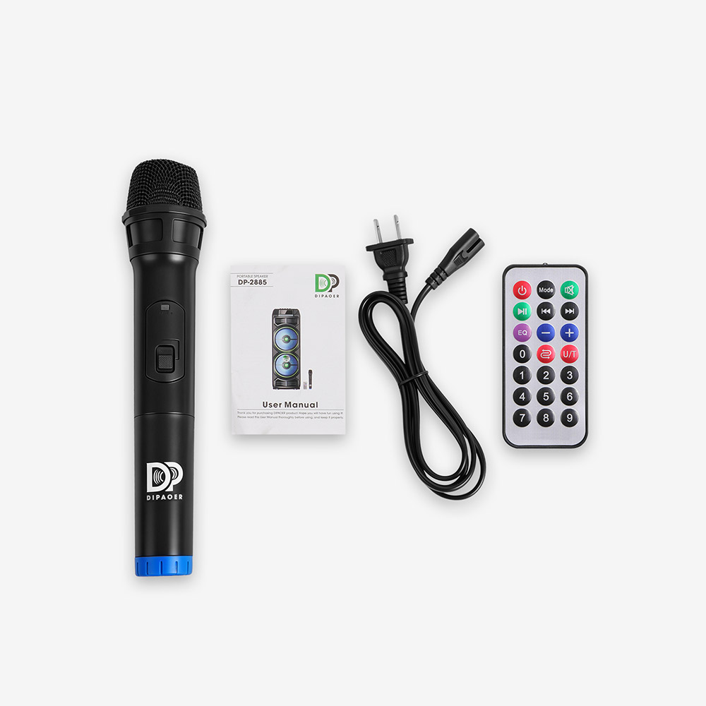 LED数显屏,实时显示电量、歌曲信息;配备多功能红外遥控器,可远程控制播放、切换曲目、灯光模式等;内置一键高清录音功能。